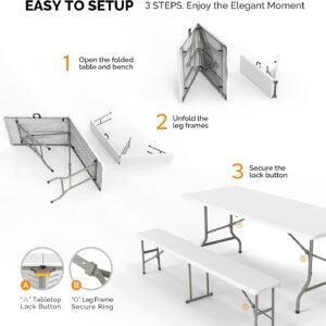 Quality and Sturdy: This 6ft long table and bench three-piece set is made with high capacity HDPE waterproof material, ensuring durability and stability. The non-slip matte surface provides a secure grip, and the sturdy triangular structure support and robust metal frame offer added strength. The fixed structure secure locks and anti-tipping safety design further enhance stability and safety